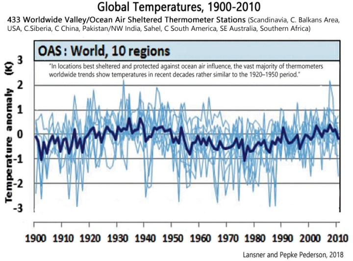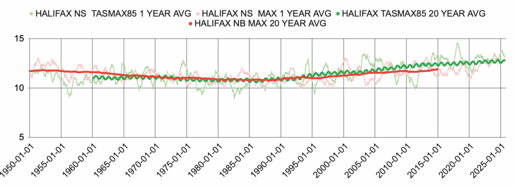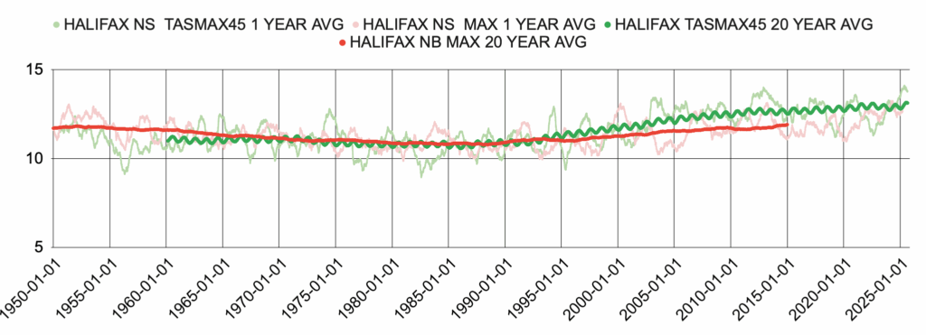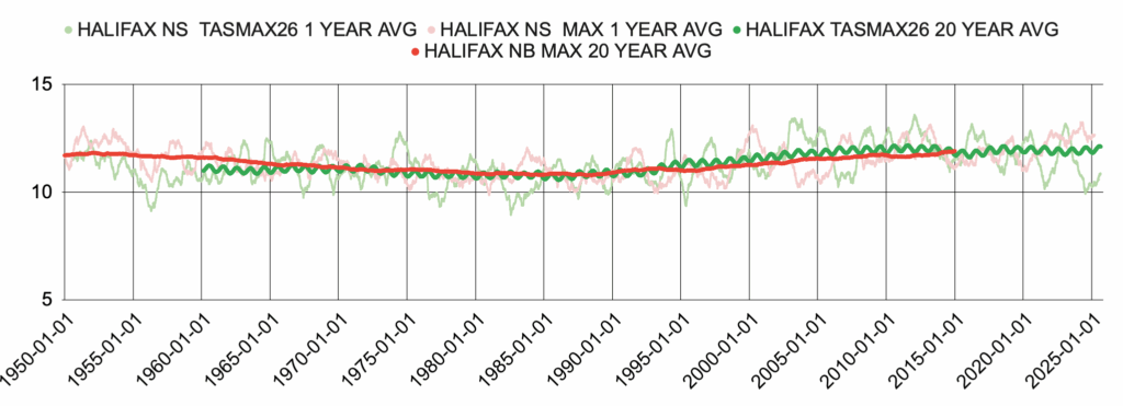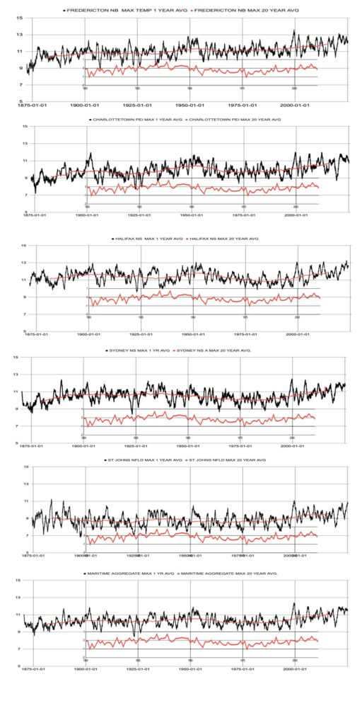 We’ve shown that in the Maritimes the data as archived in the Canadian temperature record show no detectable impact from CO2 emissions beyond the natural range. The temperatures in the 1920 – 1950 roughly are as high as today’s temperatures. There is no way to scientifically attribute current temperatures to “Climate Change” when they are the expected outcome from natural climate.