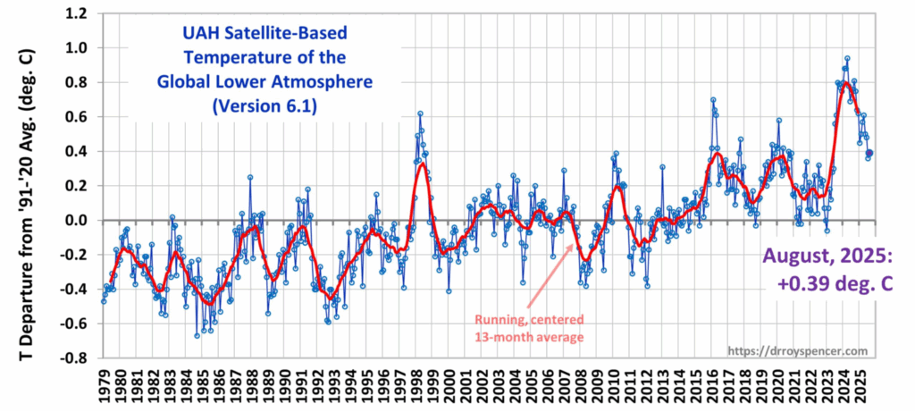There is a reason advocates of “Climate Change” tend to use averages and anomalies relative to a reference period. As figure 12 shows the anomaly, shown by the UAH data, is very small relative to the range of temperatures at an location, in this case the temperature data spans 50 degrees annually and the anomaly is about 0.5 – 1 degree or 1 – 2%. In fact it seems like a pretty stable system from 1979 – present. Anomalies like the warmth in 2024 likely are not uncommon. It is very likely the satellite data during this brief period is neither unprecedented nor historically unique. We can never know what the satellite data would have been in the 1920s – 1950s but it is reasonable to suggest the data would show anomalies equal to or greater than today’s satellite data. Certainly we can not say that there were never periods of greater global average temperatures. In spite of this shortcoming the database is really important as it will benchmark the rhetoric in the future and we will be able to confidently understand the state of the global temperature using this data as long as we understand how it relates to actual thermometer data.