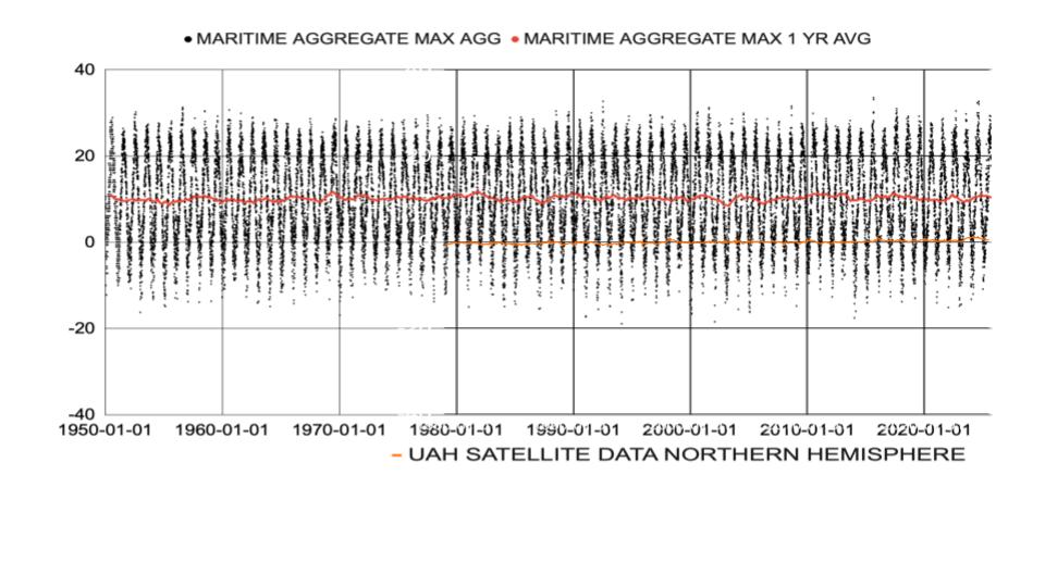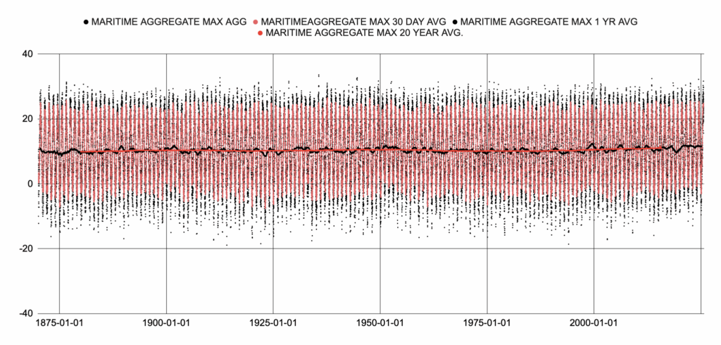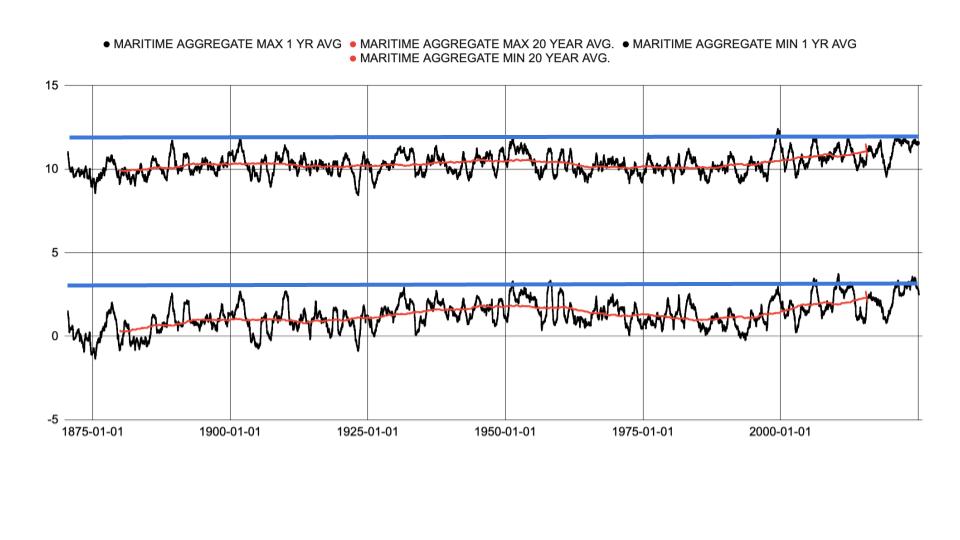 Figure 13 shows each individual location and the Maritime average compared with the 433 Location global thermometer average overlaid in red.