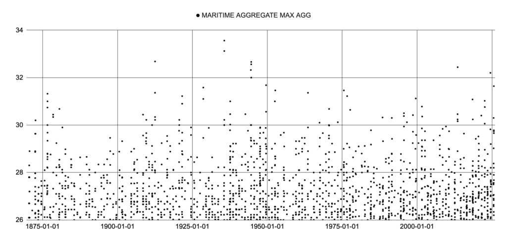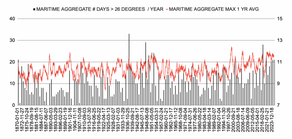 Datapoints for daily maximum temperature using a cutoff of 26 the 1920s to 1930s are home to the highest regional temperatures and there does not appear to be any trend to more hotter days.