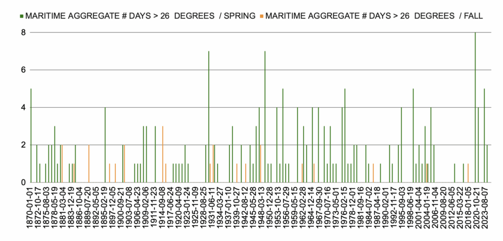 Well, they say, maybe there are more days above 26 degrees in the spring or fall. Figure 6 shows the number of days in fall and spring above 26 degrees and does not show a trend to higher temperatures in the shoulder seasons.
