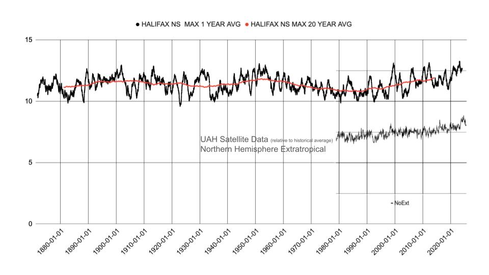 Figure 11 shows a comparison of the 1 year average daily maximum and 20 year average from the Canadian database for Halifax and the Satellite data from 1979. The satellite data is referenced to a baseline period. It is a relative temperature so we can compare the resulting trends but not absolute temperatures. The UAH data and the 20 year average from the Canadian Archive data have similar trends; cool trend from 1979 – 1998 then rising until the present. So a reasonably good agreement.